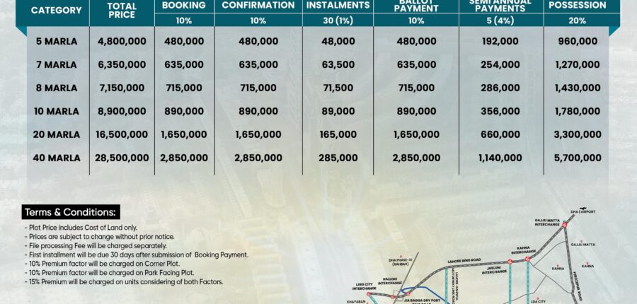 | 20 MARLA | 16,500,000 | 1,650,000 | 1,650,000 | 165,000 | 1,650,000 | 660,000 | 3,300,000 |