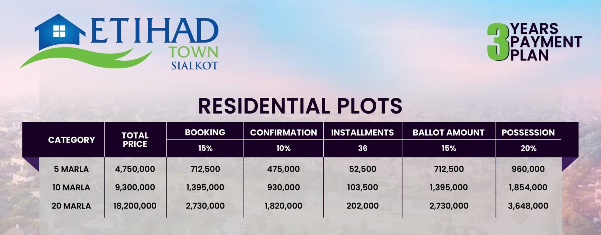 | Plot Size | Total Price | BOOKING 15% | CONFIRMATION 10% | INSTALLMENTS 36 | BALLOT AMOUNT 15% | POSSESSION 20% |